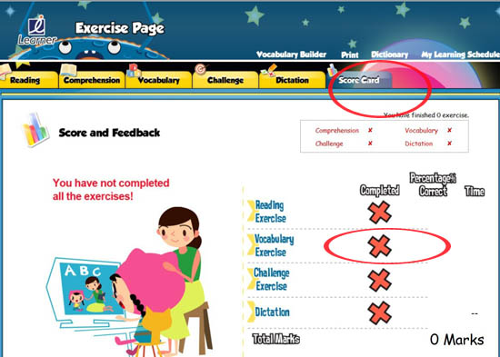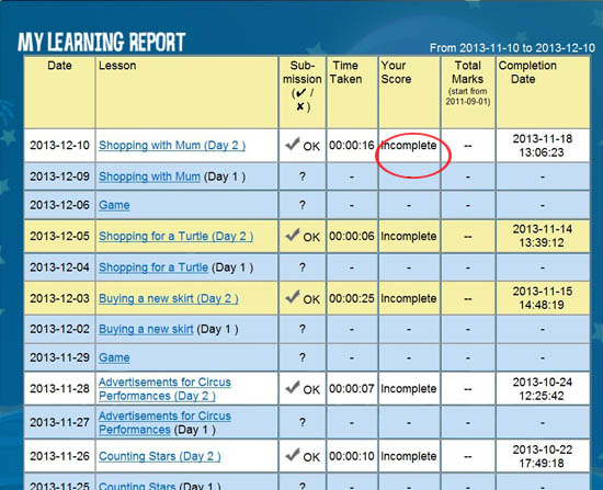 這可能是由於您只完成了幾個部分的練習中的其中一個, 所以請您檢查顯示為incomplete的練習的score card (在練習內),看看是否完全部沒有X的部分, 並已經有總分。如有X的部分,那麼您只要把那些部分的練習都完成便可以了!
